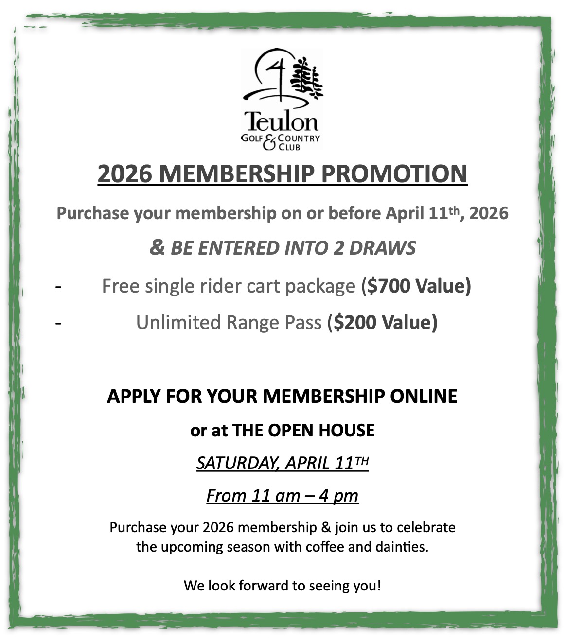 Please Note – The online booking system is through a popular third-party provider that many courses use – TGCC is not responsible for any cancellation or booking fees that may result from booking through this system.